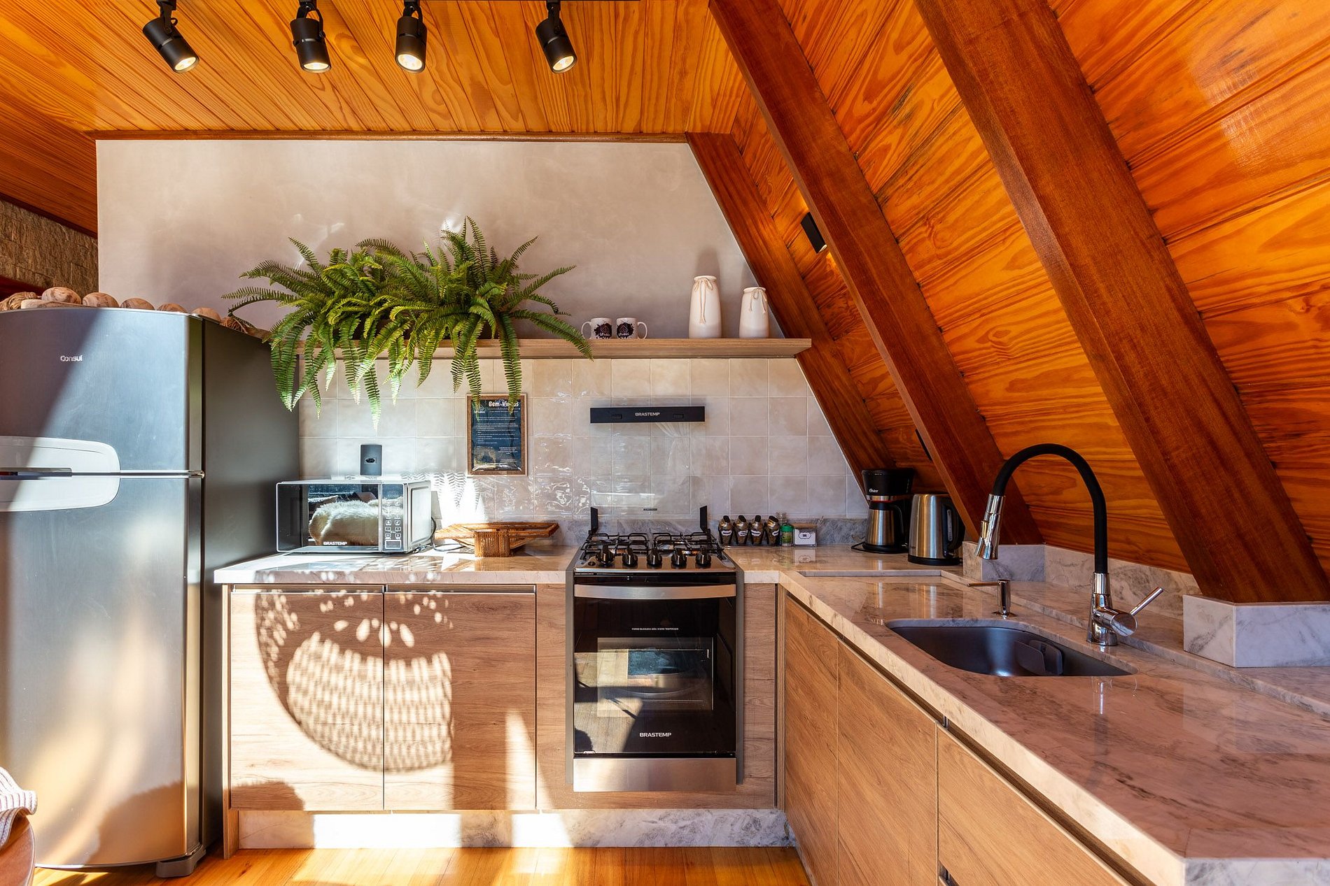 - Deck com vista para as montanhas- A cozinha é bem completa e com vários utensílios domésticos.