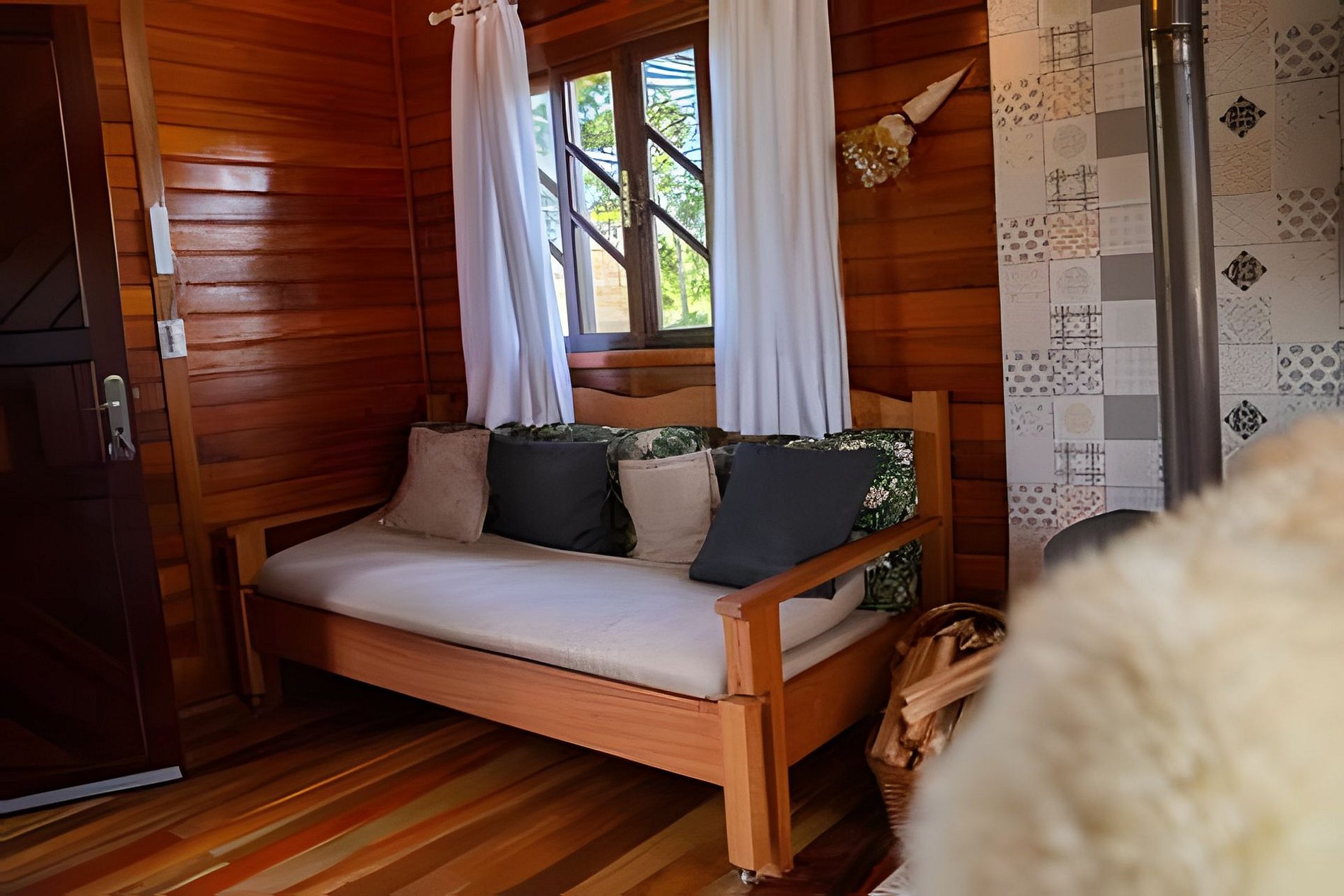 - O Chalé conta com dois quartos, ambos com vista para a natureza, churrasqueira na parte inferior e fogo de chão.