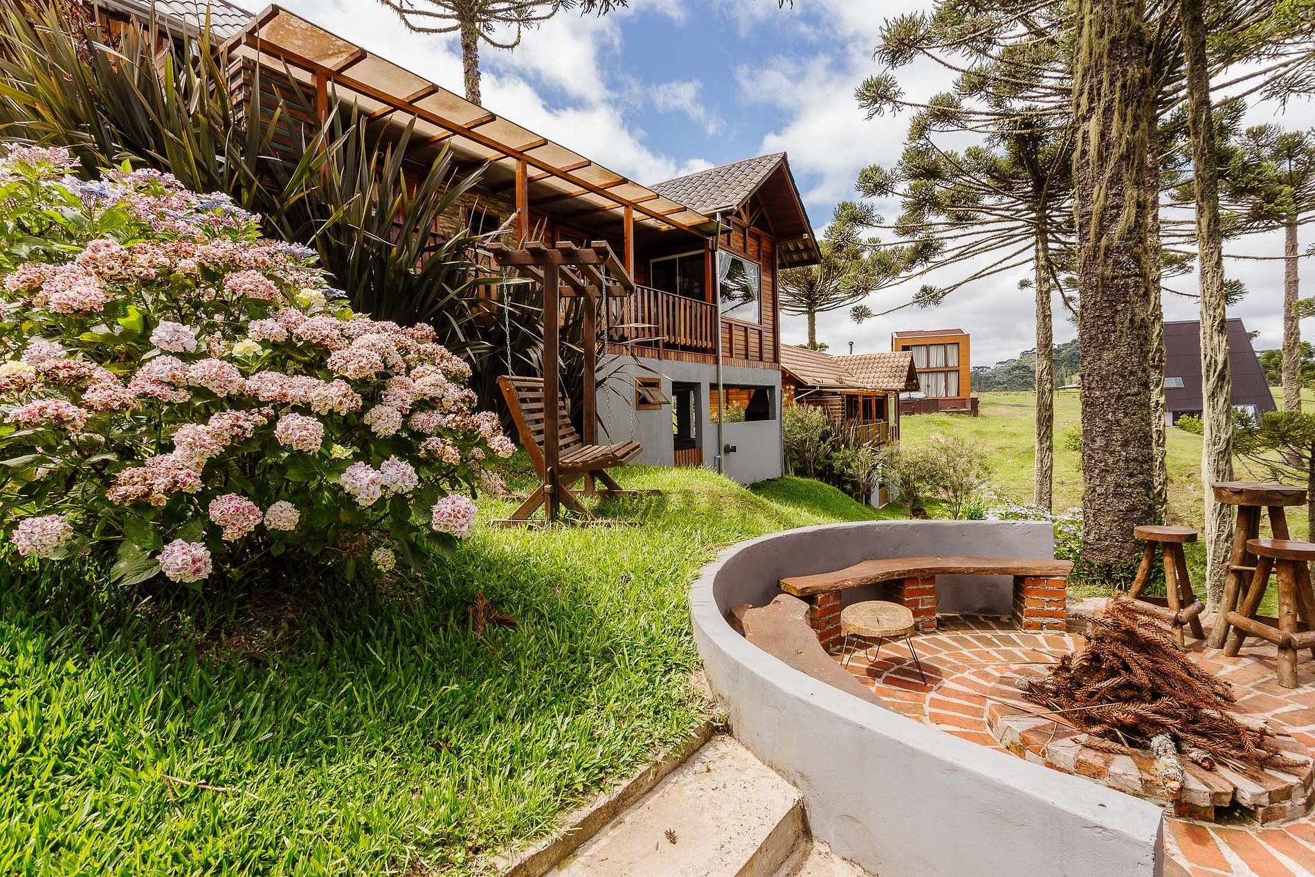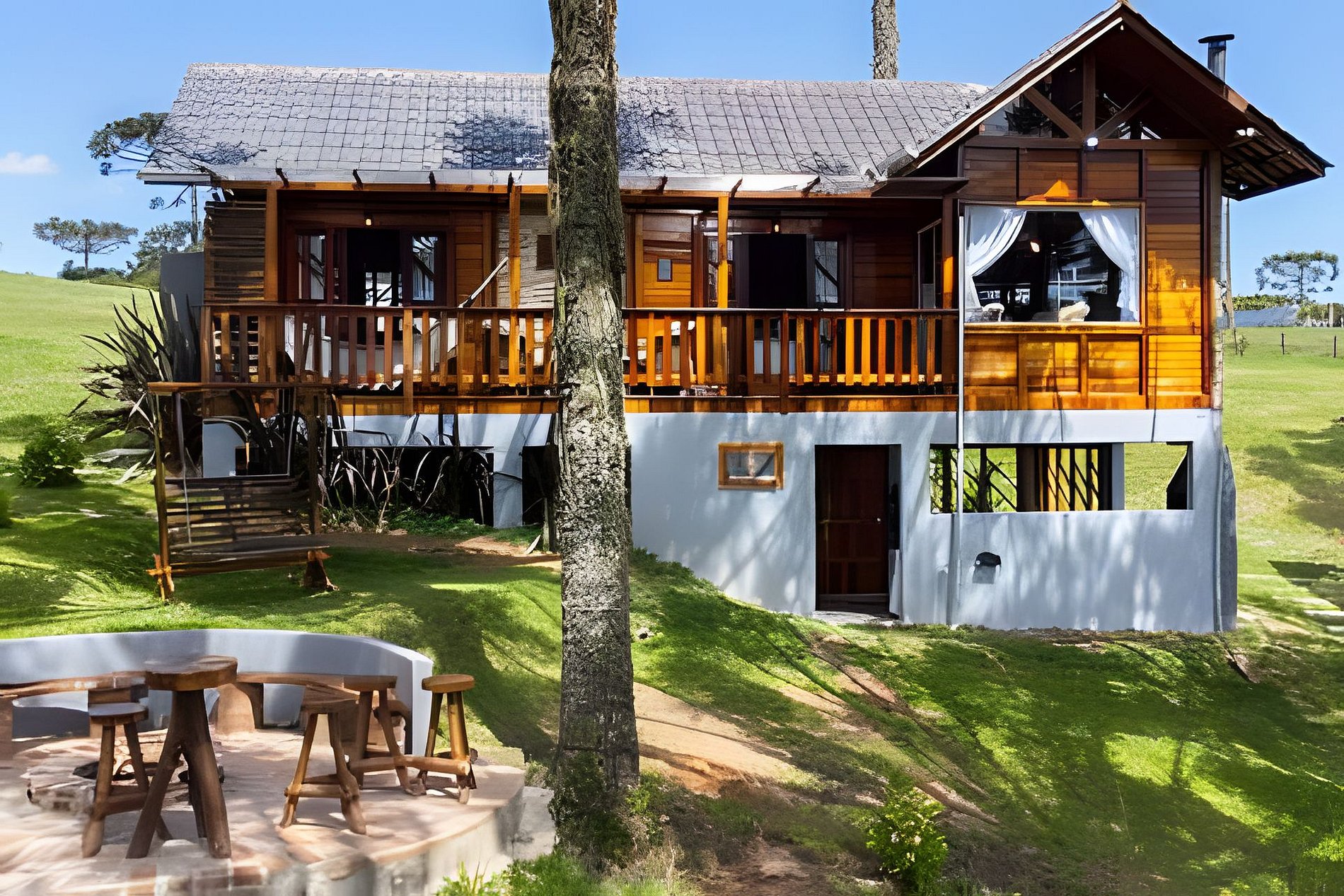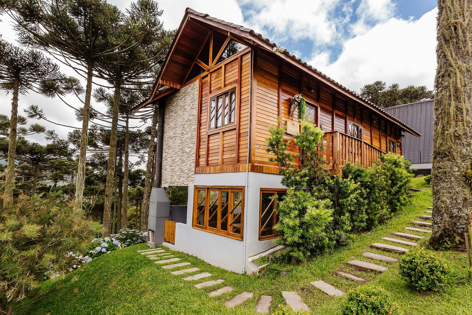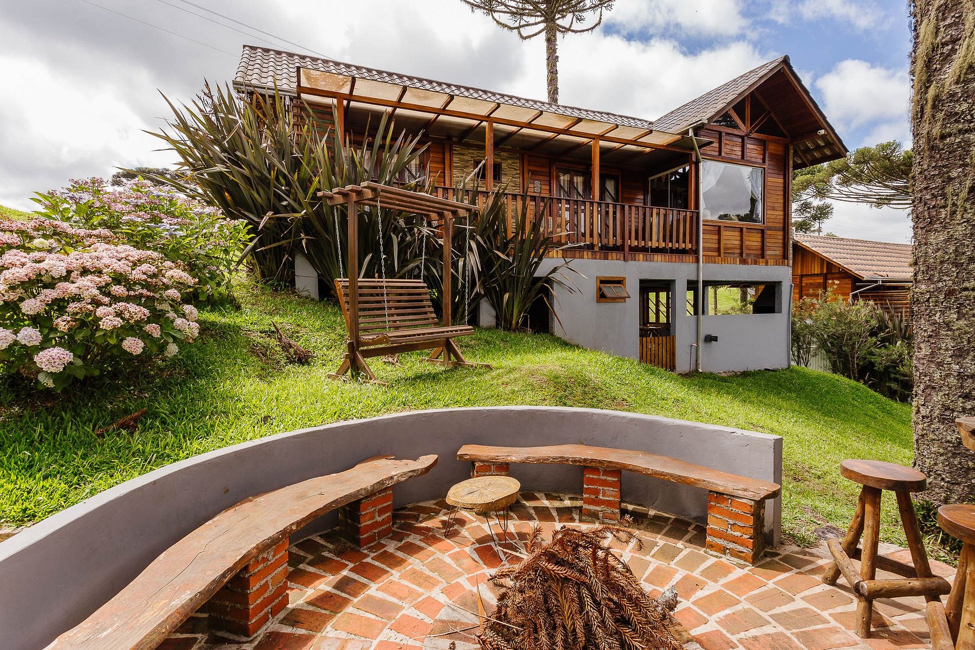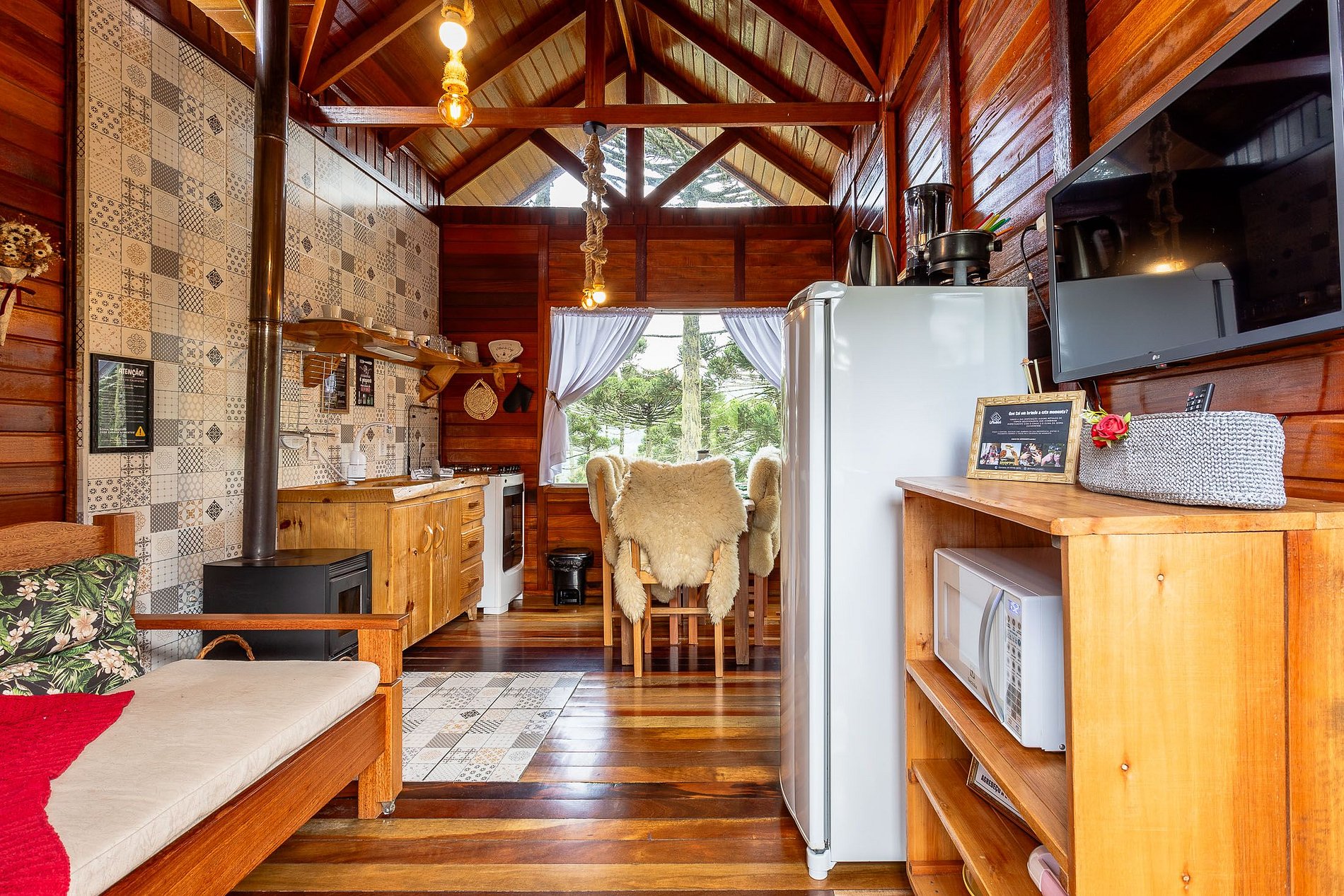 - O Chalé conta com dois quartos, ambos com vista para a natureza, churrasqueira na parte inferior e fogo de chão.
