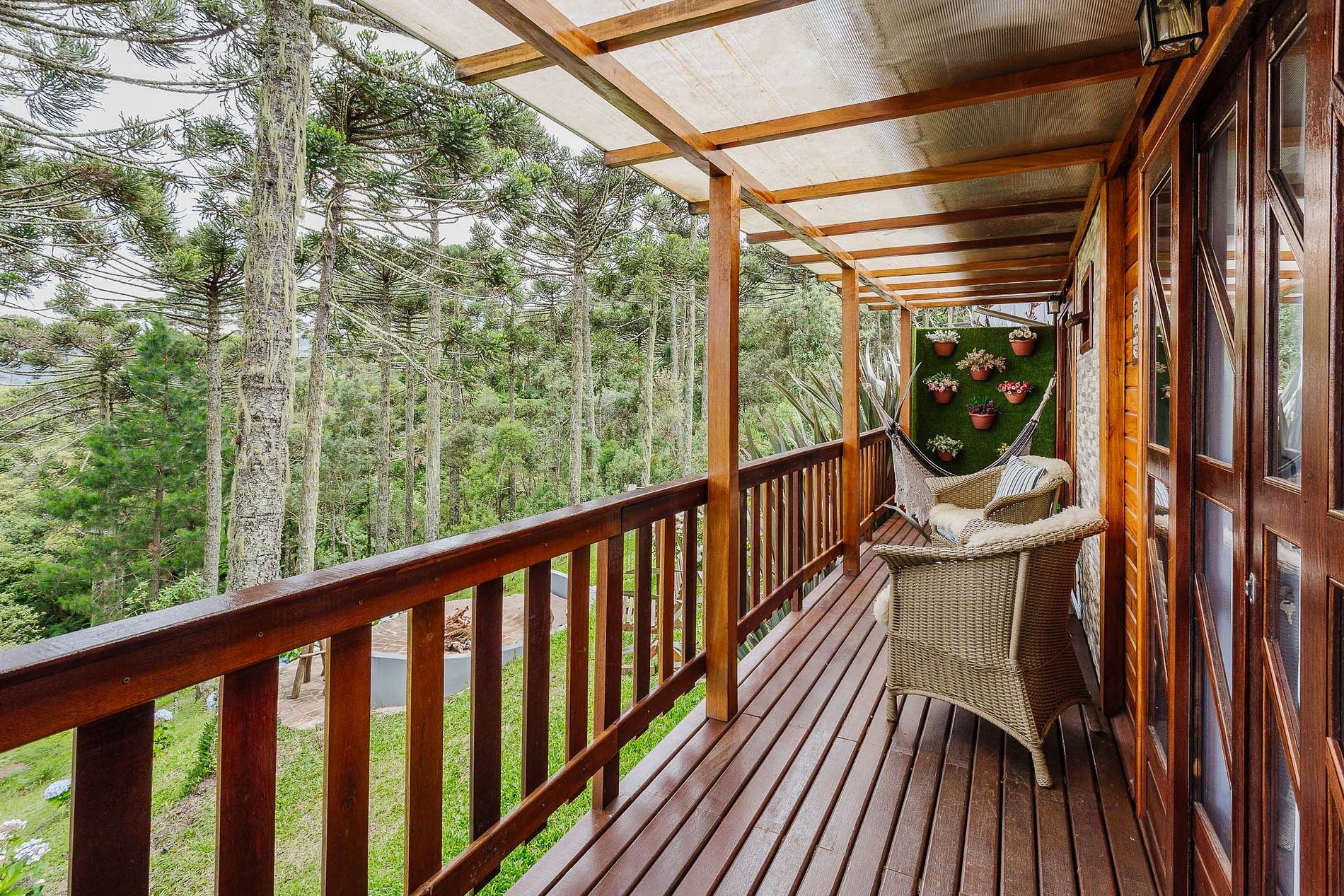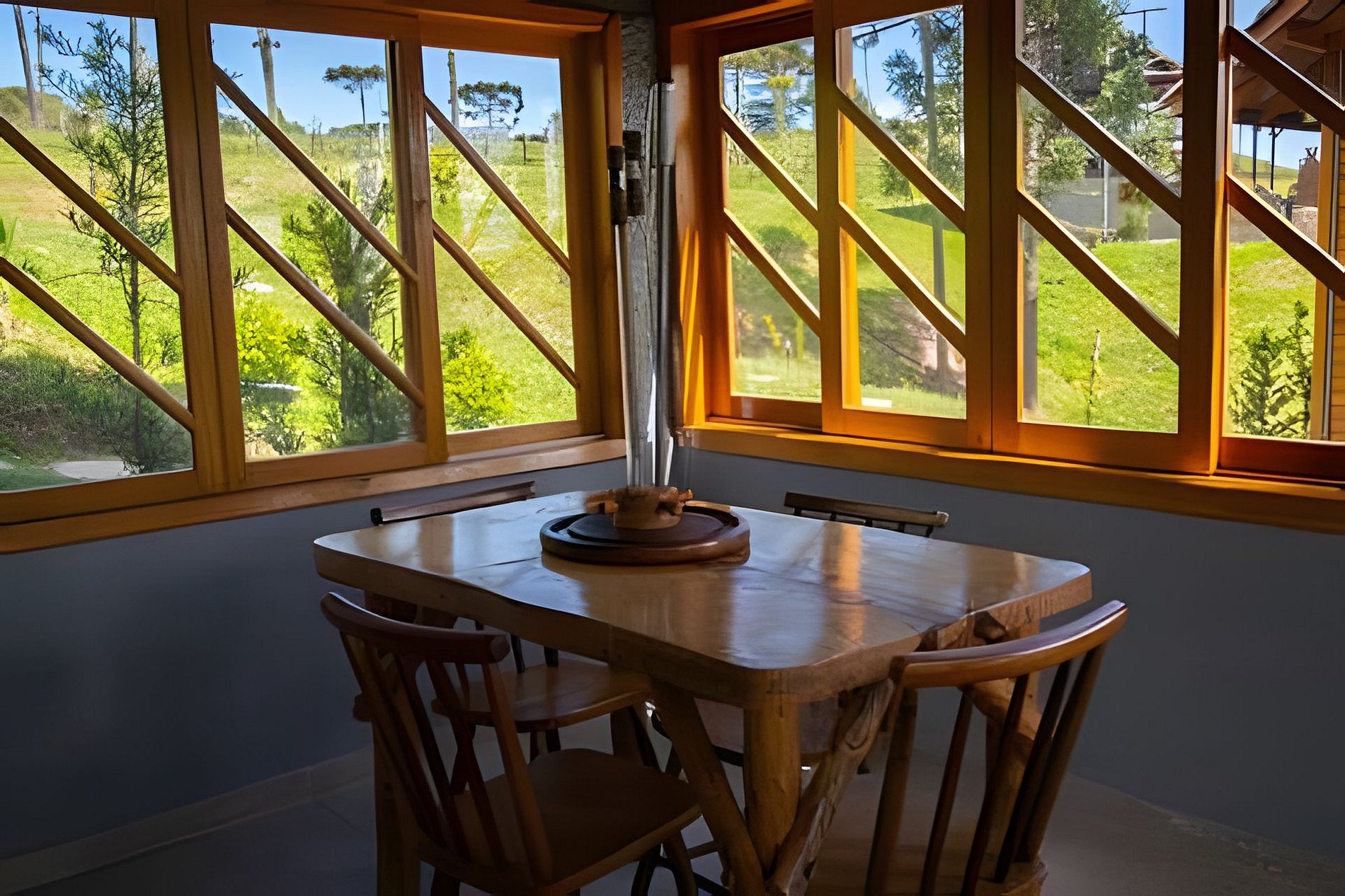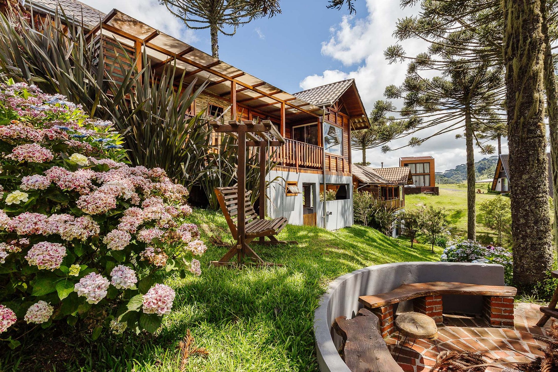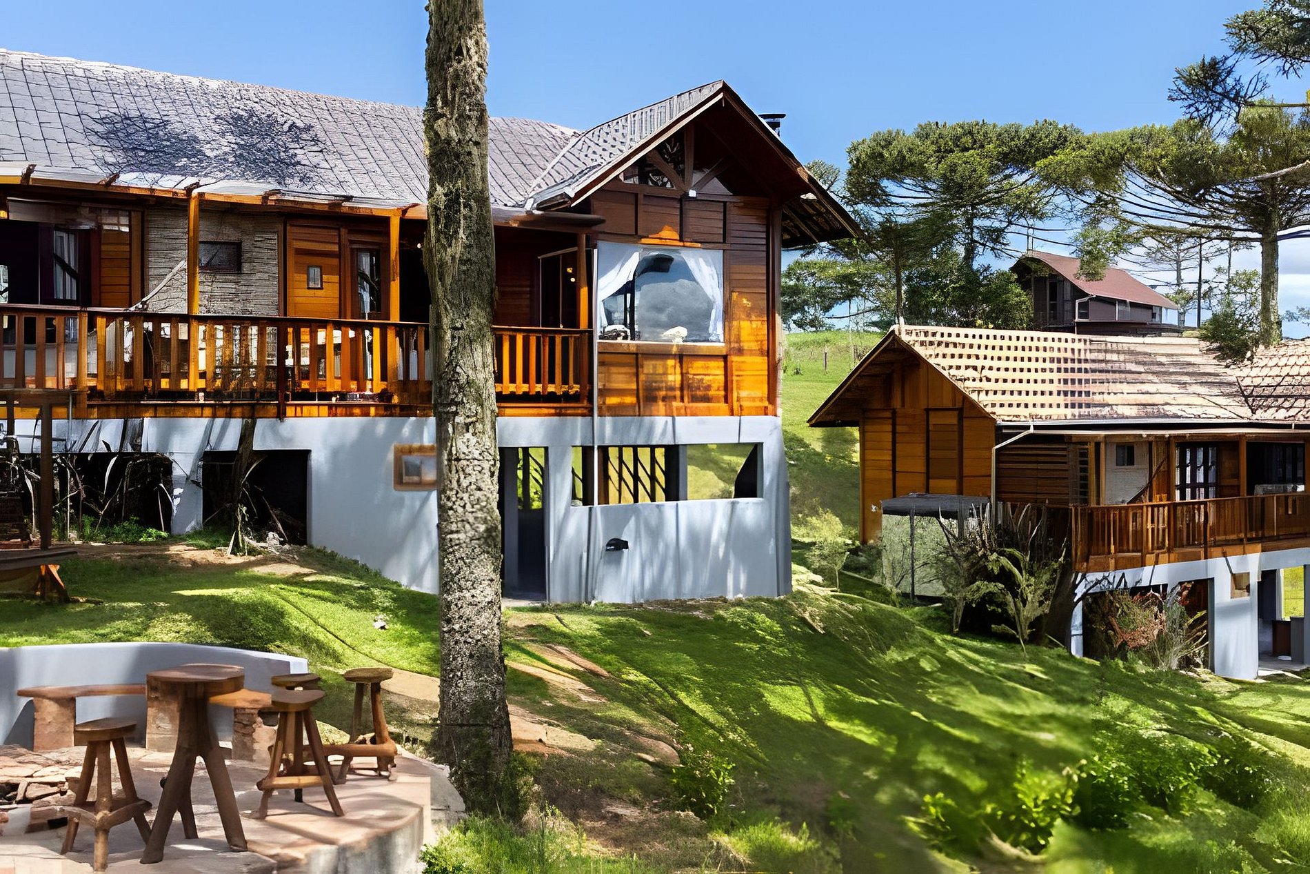 - O Chalé conta com dois quartos, ambos com vista para a natureza, churrasqueira na parte inferior e fogo de chão.