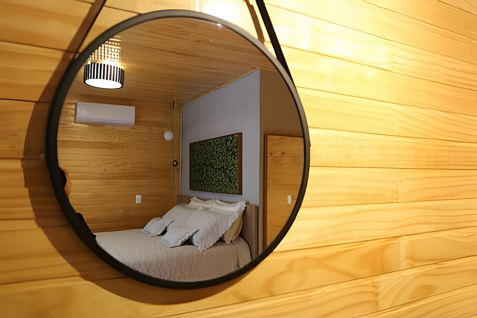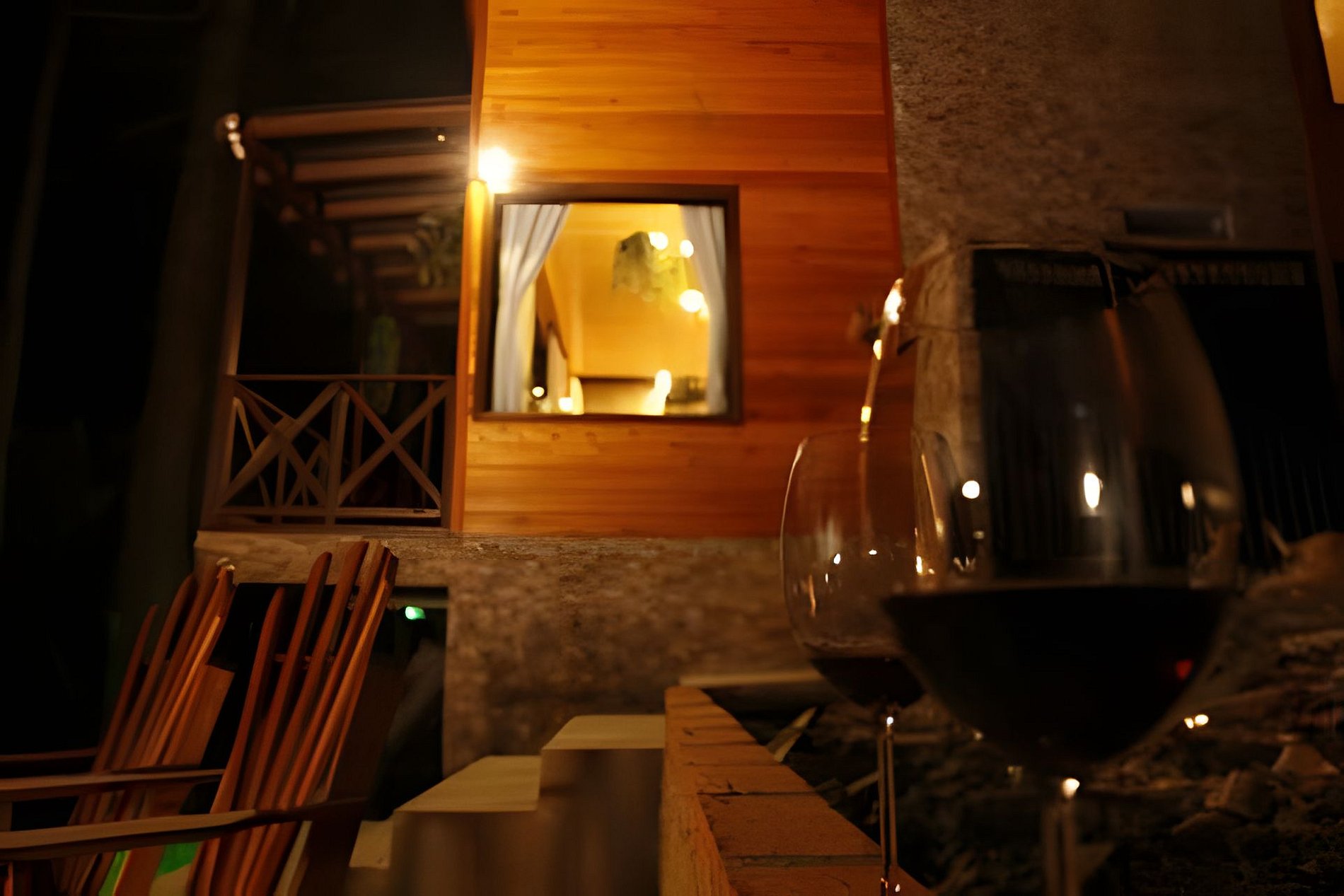 O chalé conta com dois quartos, ambos com vista para a natureza. Cada quarto possui uma cama de casal e uma de solteiro retrátil que fica por baixo da cama de casal. Disponibilizamos toda roupa de cama e banho padrão hotelaria. Disponibilizamos também roupão, shampoo, condicionador, sabonete líquido, sais de banho e lenha. O Chalé conta ainda com uma churrasqueira gourmet na parte interior e fogo de chão na área externa. A cozinha é bem completa com vários utensílios domésticos - O café da manhã é oferecido a parte.