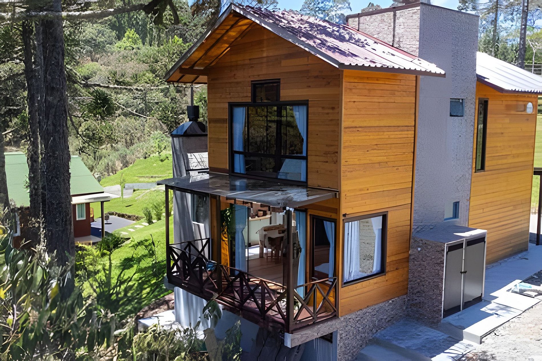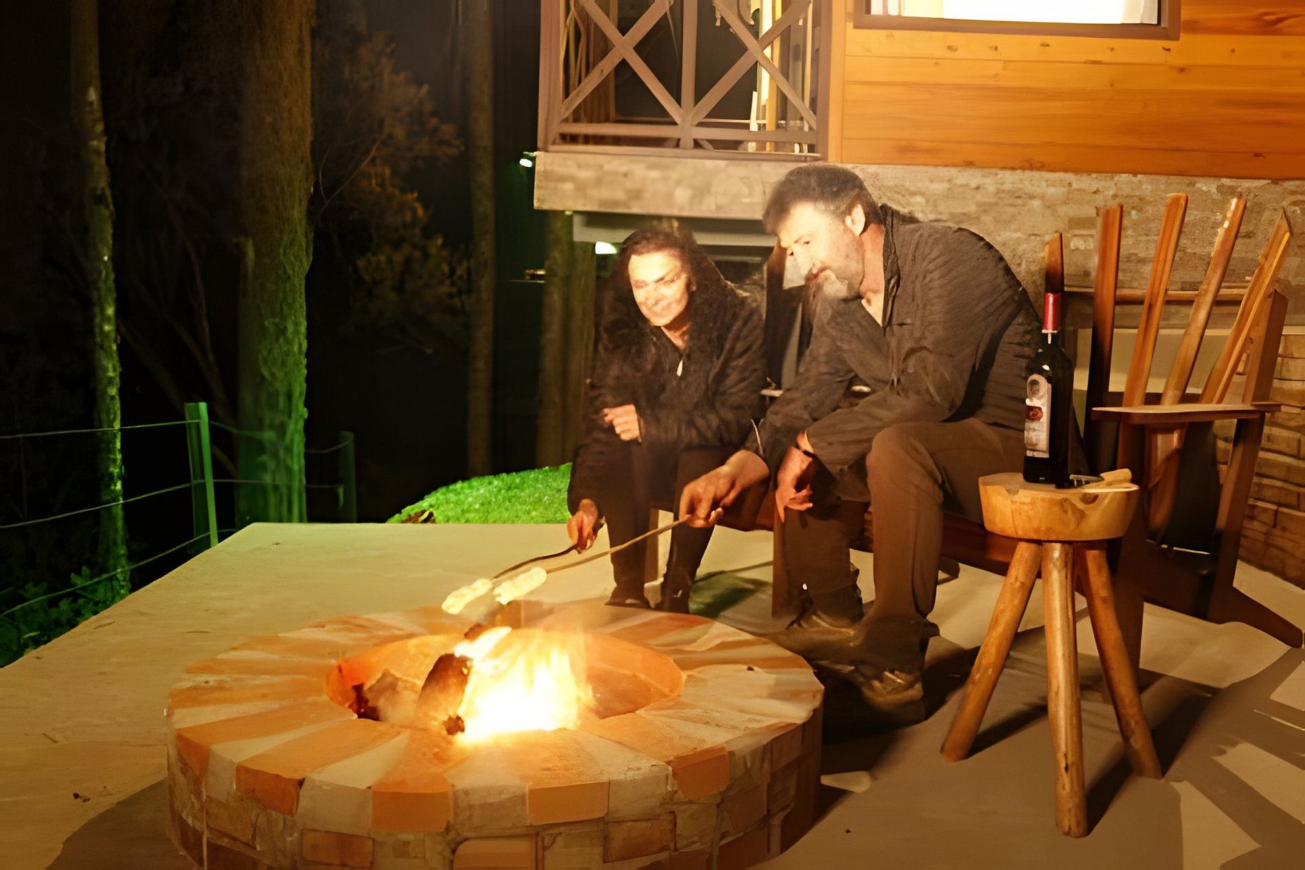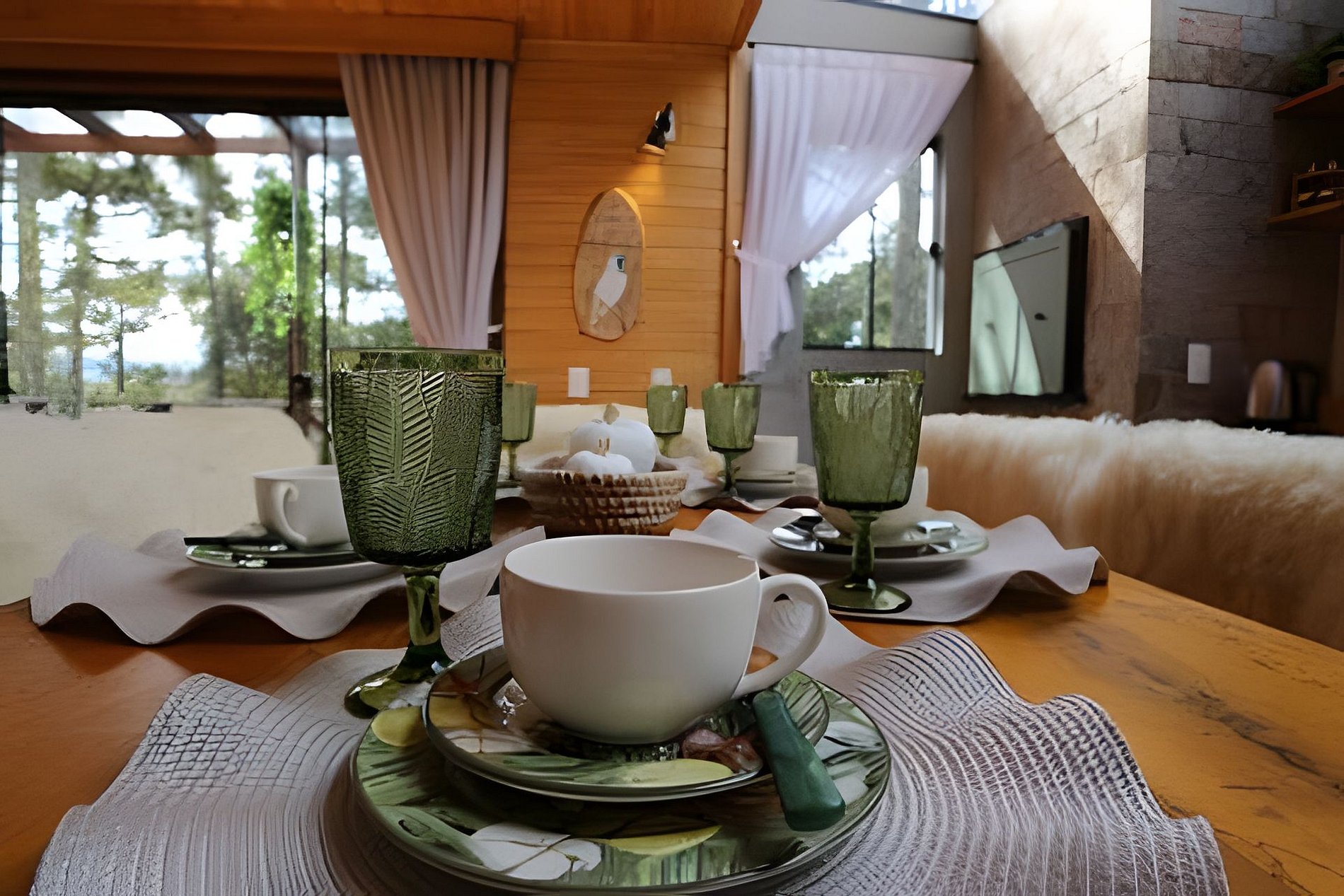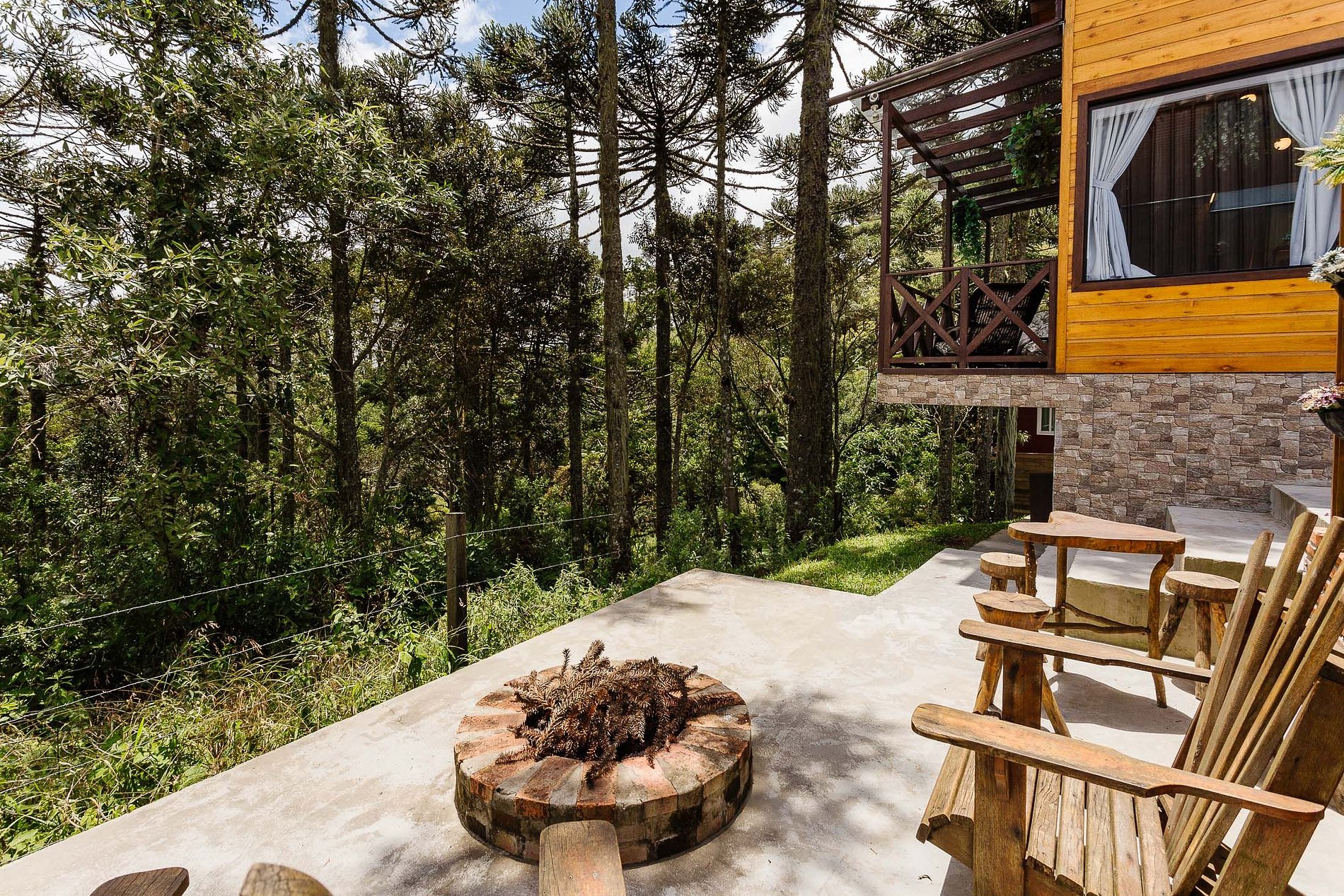 O chalé conta com dois quartos, ambos com vista para a natureza. Cada quarto possui uma cama de casal e uma de solteiro retrátil que fica por baixo da cama de casal. Disponibilizamos toda roupa de cama e banho padrão hotelaria. Disponibilizamos também roupão, shampoo, condicionador, sabonete líquido, sais de banho e lenha. O Chalé conta ainda com uma churrasqueira gourmet na parte interior e fogo de chão na área externa. A cozinha é bem completa com vários utensílios domésticos - O café da manhã é oferecido a parte.