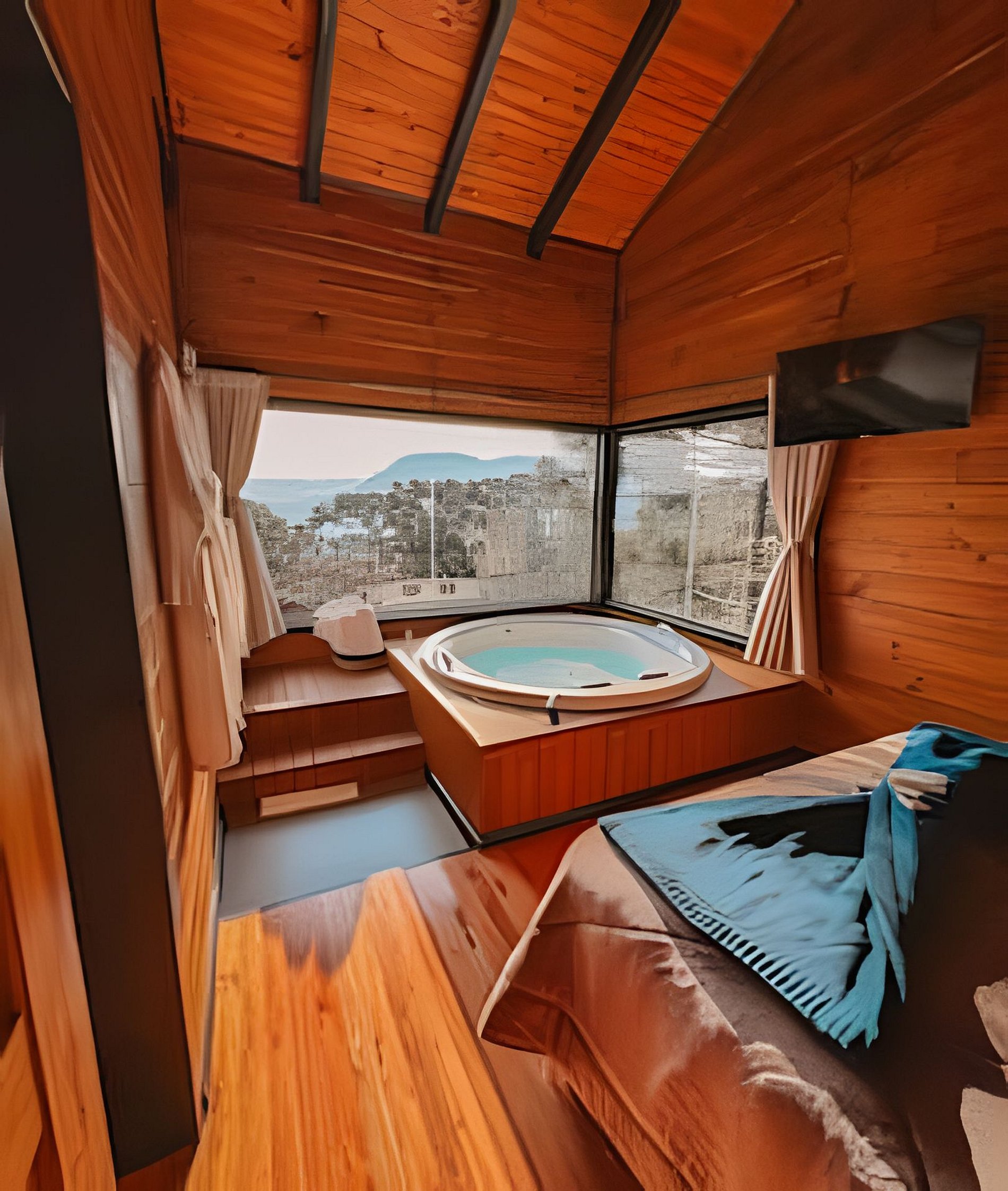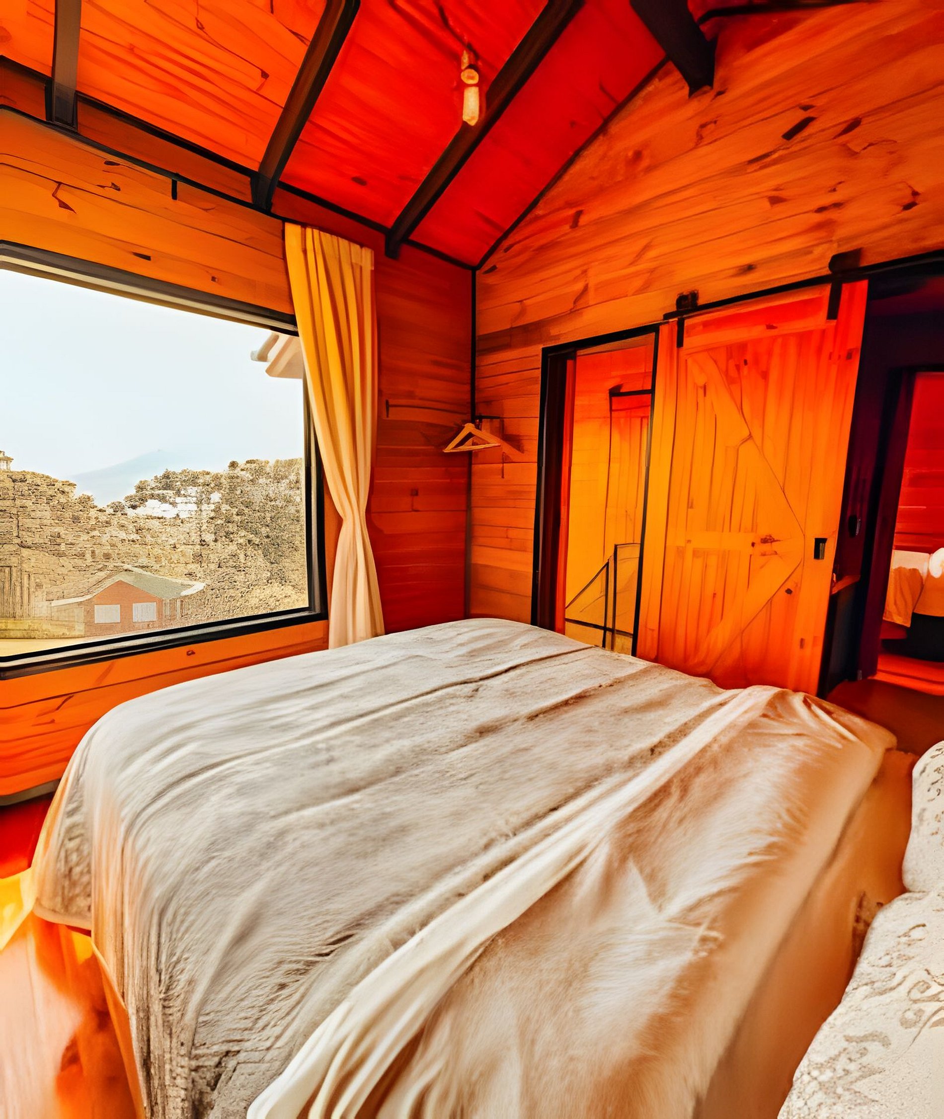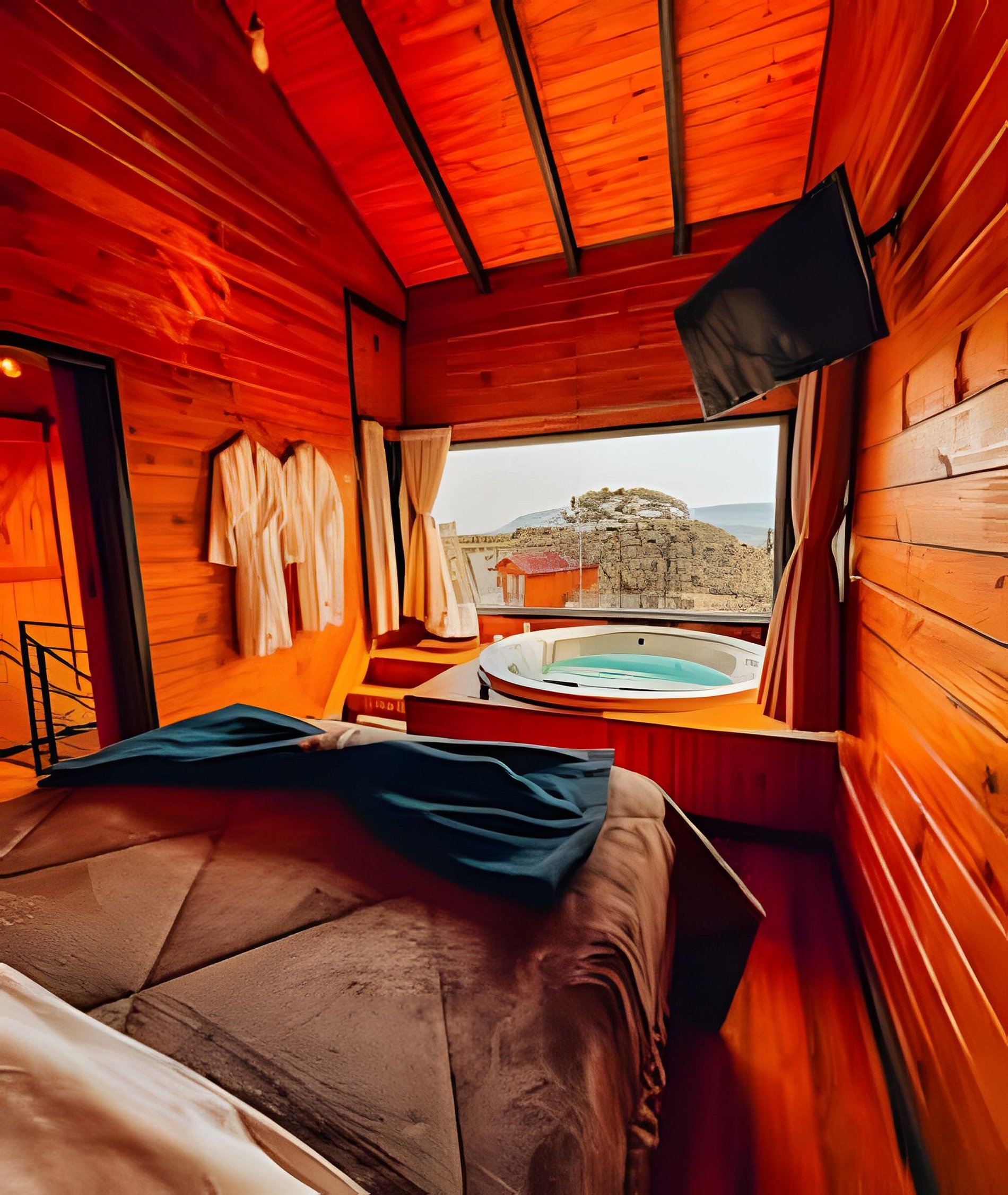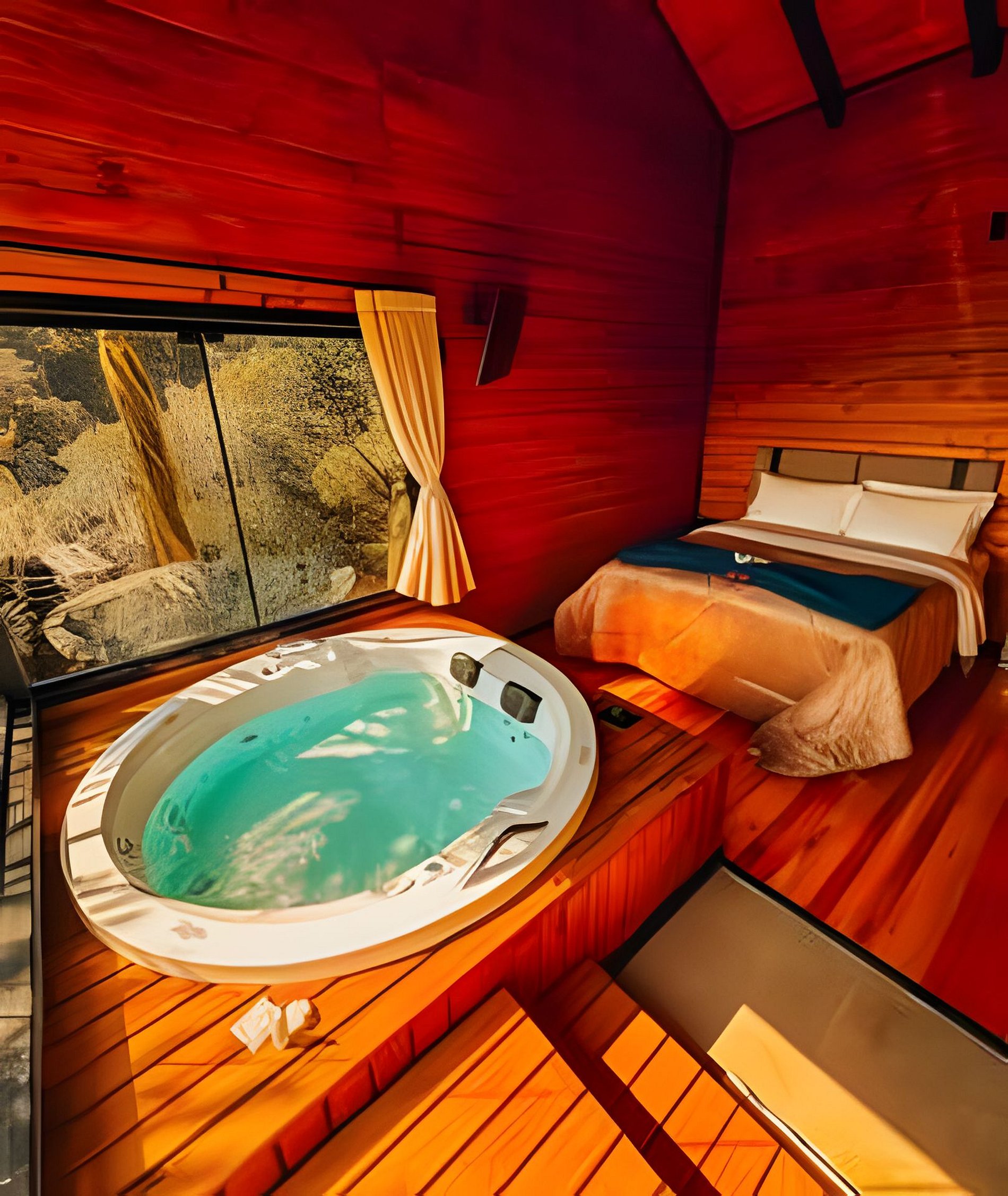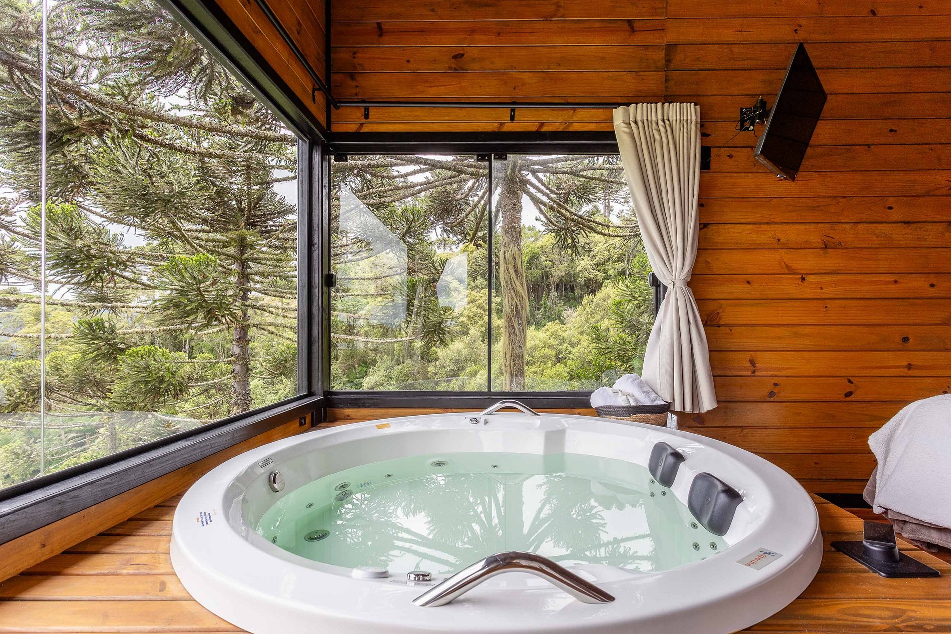 No pavimento térreo você encontrará uma cozinha completa, lavabo e uma sala de estar com lareira de pedra e TV. No andar superior estão os quartos e o banheiro com dois chuveiros com aquecimento a gás. Em um dos quartos você encontrará uma banheira de hidromassagem com uma vista incrível. Na área externa da cabana você terá acesso a um deck amplo, uma rede suspensa para contemplar o pôr do sol e um espaço com fogo de chão. Para finalizar, temos um ambiente surpresa para nossos hóspedes com acesso pela sala de estar.