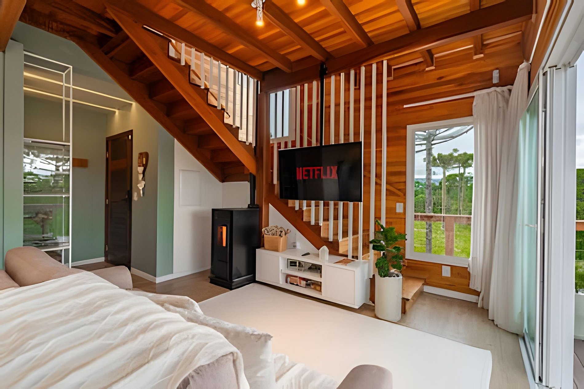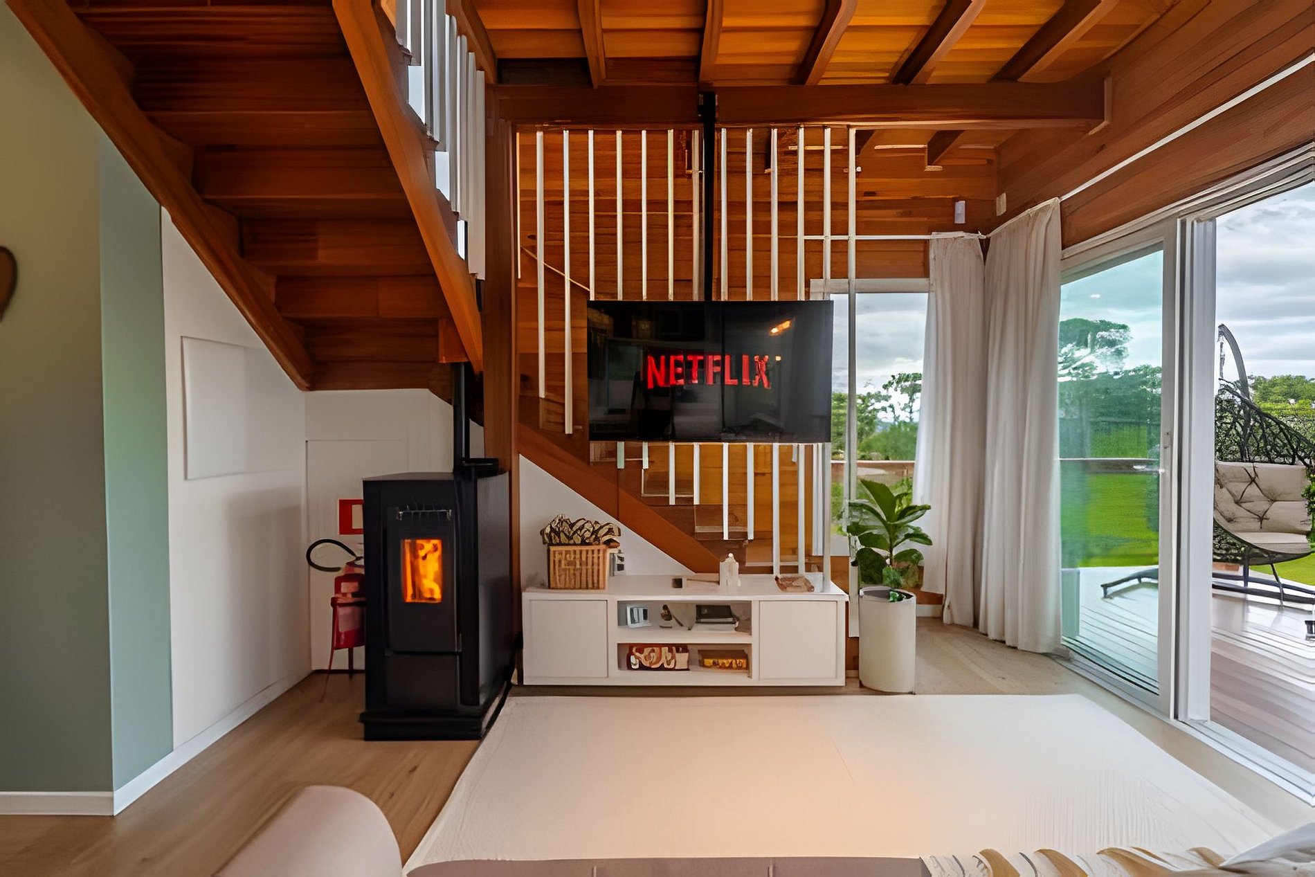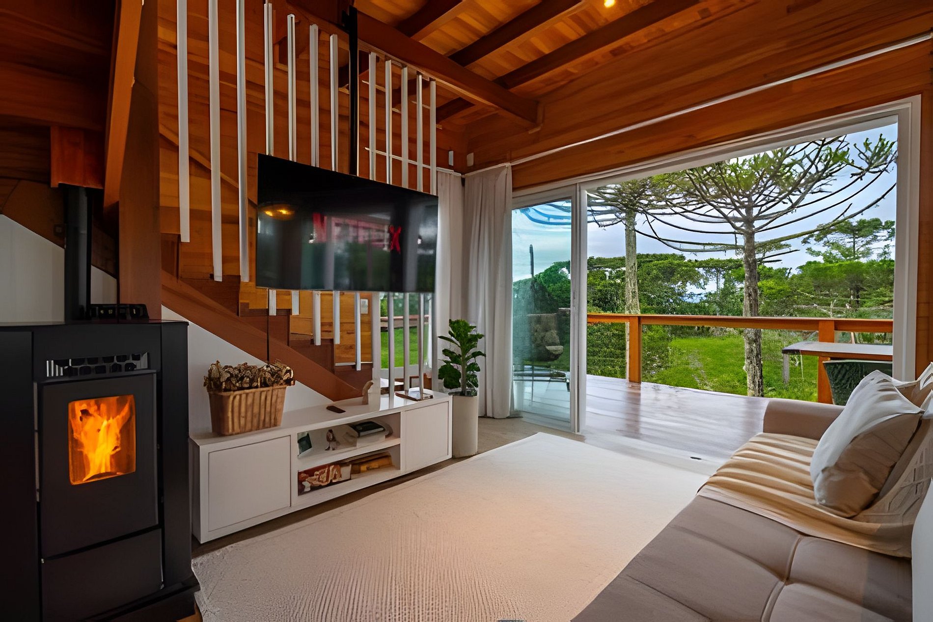 - Sala de estar com sofá, cortina, smart TV de tela plana 50” com Netflix disponível, calefator à pellet;
