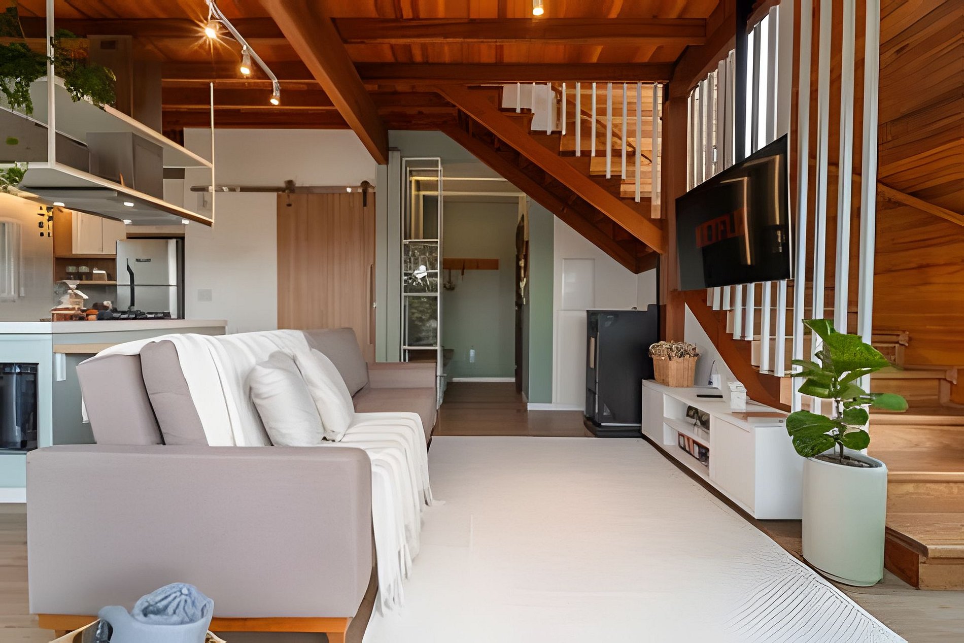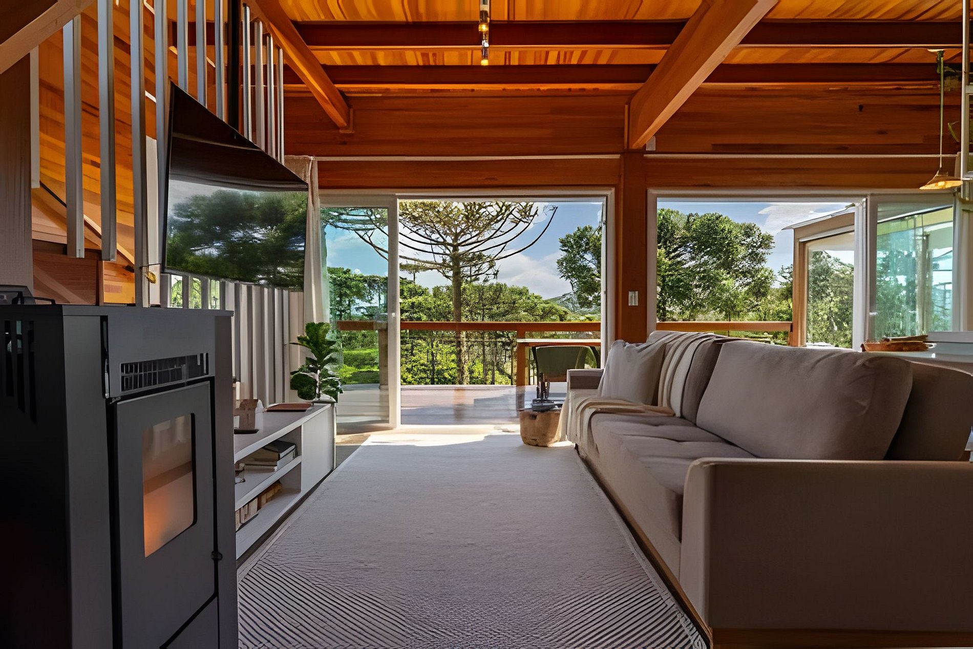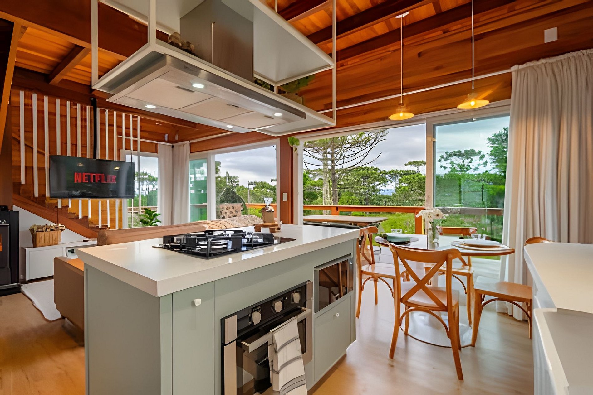 - Sala de estar com sofá, cortina, smart TV de tela plana 50” com Netflix disponível, calefator à pellet;