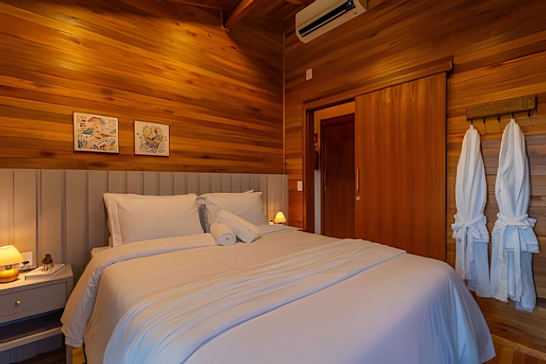 - 01 Quarto com cama Queen, cortina, arara para roupas e ar-condicionado;