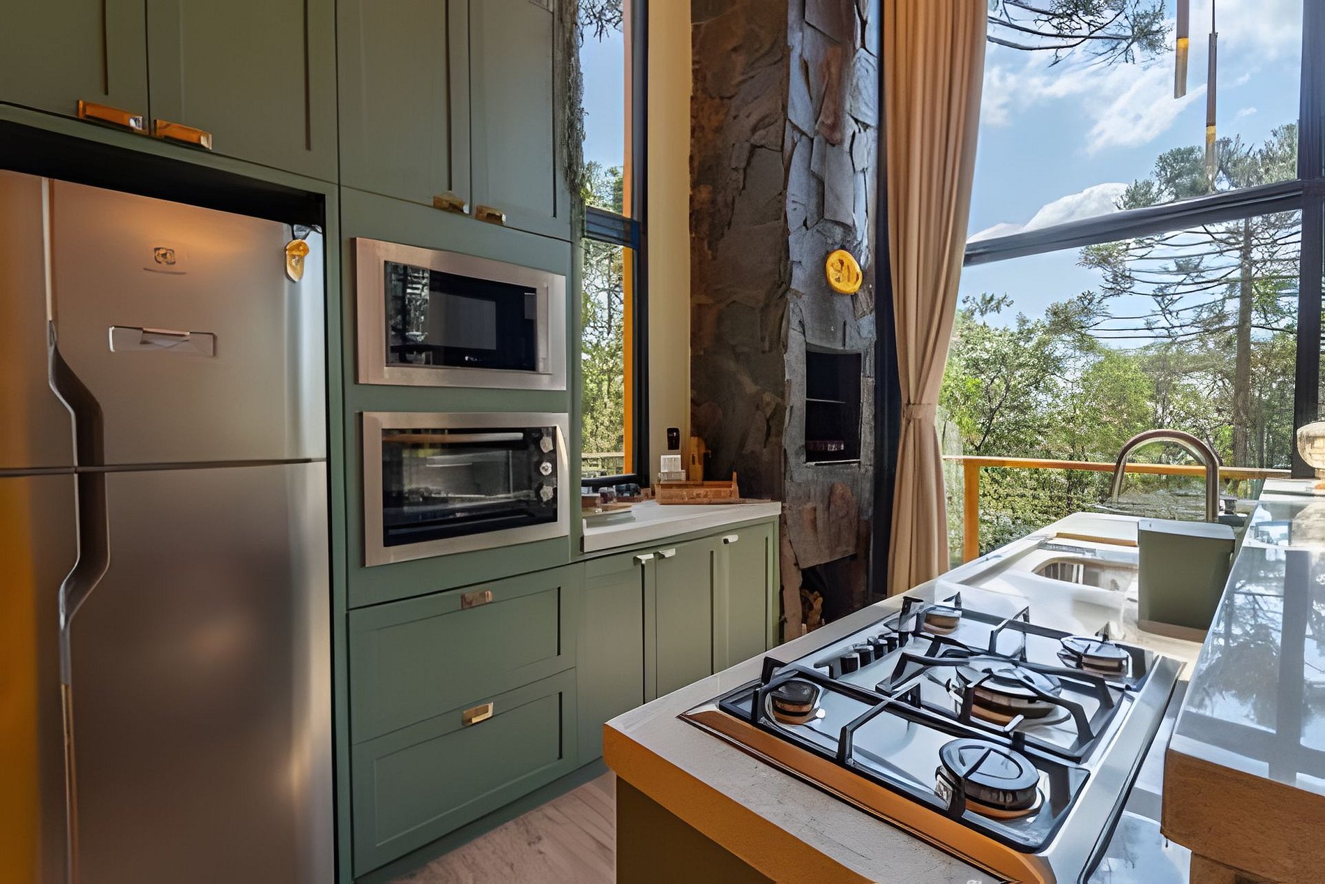 - Cozinha completa com geladeira, fogão, forno, micro-ondas, sanduicheira, cafeteira, liquidificador, taças de vinho, panelas, louças e utensílios;
